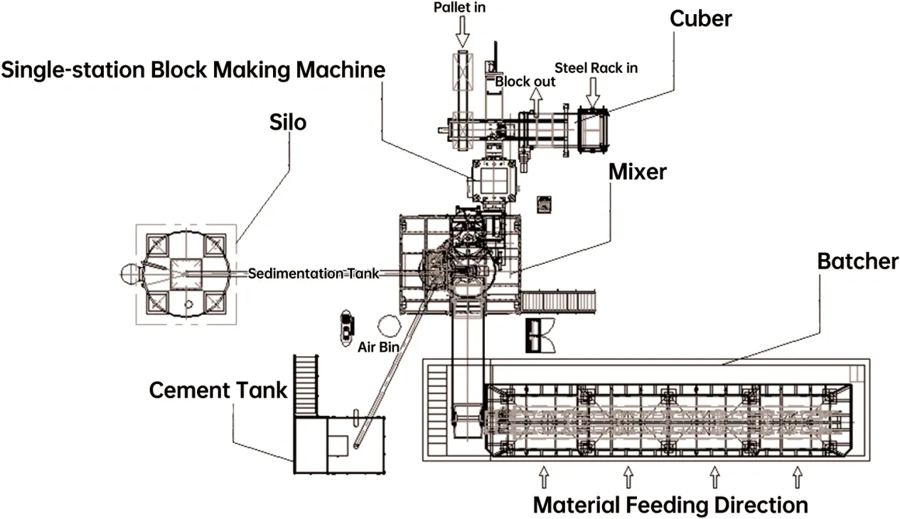 De productielijn bereikt een nauwkeurige materiaalformulering via een batch- en mengsysteem. Materialen worden via banden getransporteerd en in de mixer getild, waar een grondige menging plaatsvindt voordat ze worden overgebracht naar de tegenoverliggende materiaalmixer. De hoofdperstafel schuift naar buiten en tijdens de toevoer van oppervlaktemateriaal verdeelt een doseerbunker het materiaal nauwkeurig in het matrijsframe op de schuiftafel. De tafel beweegt vervolgens onder het persframe voor persfiltratievorming. Ondertussen worden pallets door de palletfeeder op de secundaire positie van de tafel afgeleverd. Tijdens de volgende doseercyclus worden de gevormde stenen automatisch uit de vorm gehaald. Het systeem voltooit synchroon het aanvoeren van pallets en het verwijderen van natte stenen tijdens het persproces, waardoor een efficiënte en continue productie wordt gegarandeerd.