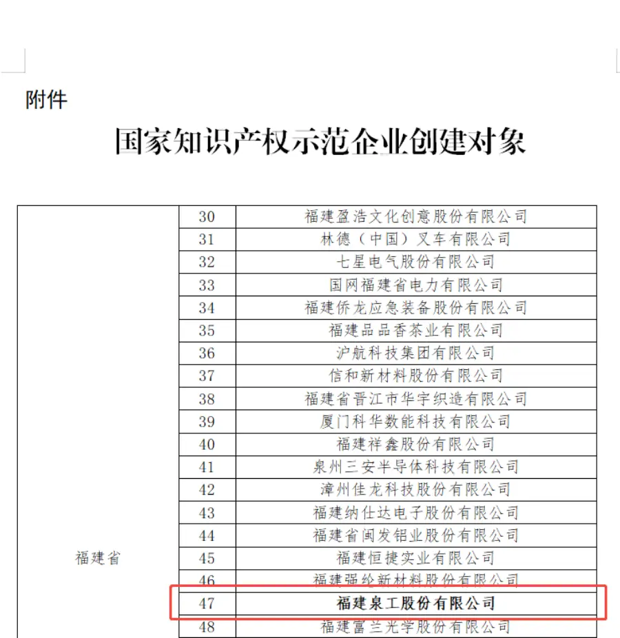 Onlangs heeft de National Intellectual Property Administration (CNIPA) de "Aankondiging over de evaluatieresultaten van de National Intellectual Property Strong Country Construction Demonstration Creation Objects" vrijgegeven.Fujian Quangong Machinery Co., Ltd.werd met succes geselecteerd als een "Nationaal Intellectueel Eigendomsdemonstratie Enterprise Creation Object voor 2025-2027" op basis van zijn uitgebreide kracht op het gebied van creatie, gebruik, bescherming en beheer van intellectueel eigendom. Deze succesvolle selectie betekent een gezaghebbende erkenning op nationaal niveau van de inspanningen van Quangong Machinery Co., Ltd. bij het bevorderen van hoogwaardige ontwikkeling van intellectueel eigendom en het dienen van de nationale strategie van het opbouwen van een sterke natie op het gebied van intellectueel eigendom.